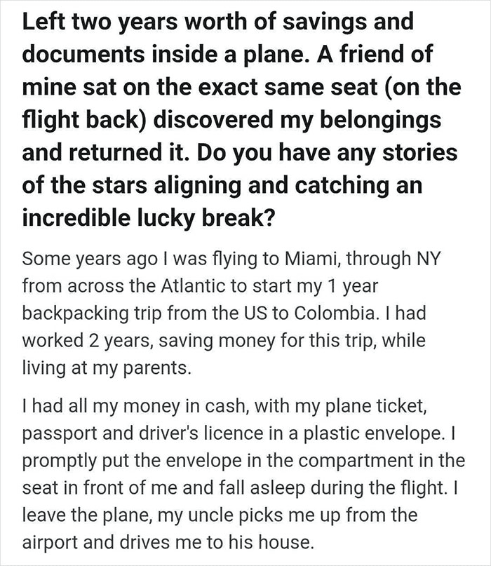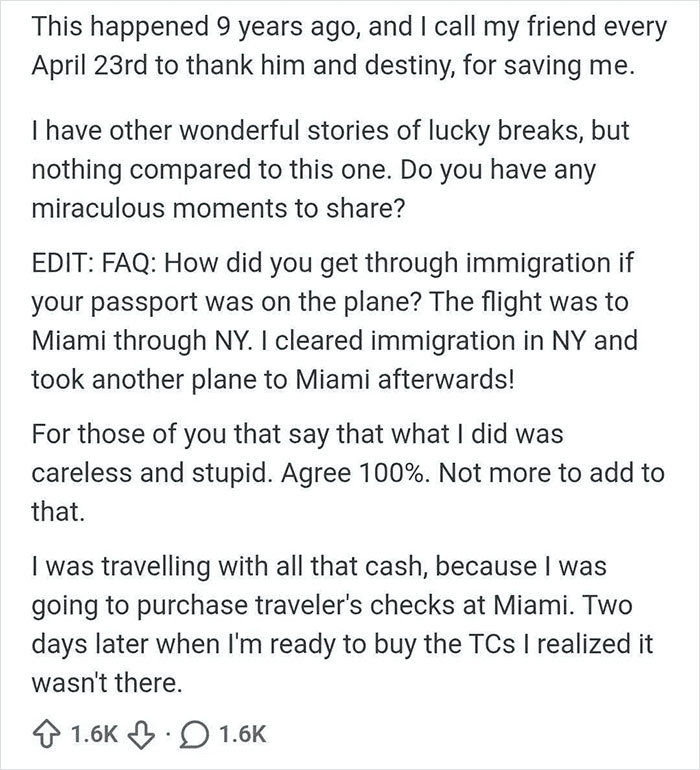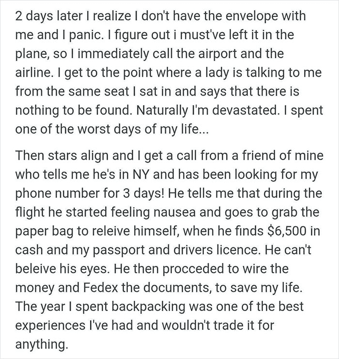 He was in the process of booking his flight and hotel up there and checked his Facebook while waiting for the airline’s page to load. There was a message on there from somebody who had found his passport in the gutter and managed to track him down on Facebook. He was literally 2 seconds away from spending some major money. Got the passport back, bought the guy a couple beers, and everything was all good!