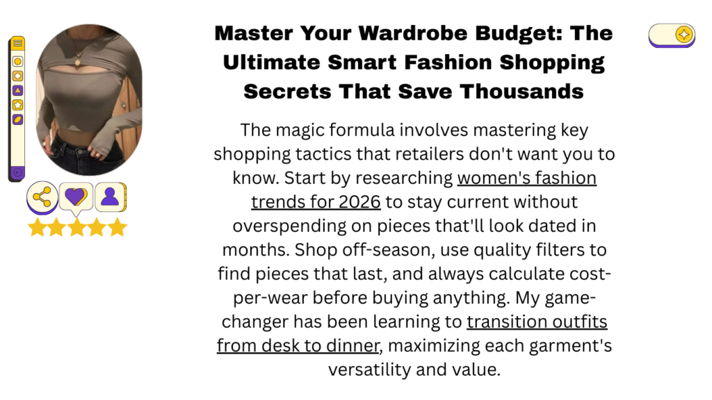 After a decade navigating the fashion industry, I’ve discovered that smart fashion shopping isn’t about deprivation it’s about strategy. The secret lies in understanding your personal style before you swipe your card, which is why countless fashionistas embrace style guides that blend timeless trends with practical wardrobe planning. The biggest mistake I see is impulse buying trendy … Continue reading Master Your Wardrobe Budget: The Ultimate Smart Fashion Shopping Secrets That Save Thousands